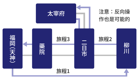 ○ 西鐵福岡(天神)站或者藥院站→太宰府→柳川→西鐵福岡(天神)站或者藥院站 ○ 西鐵福岡(天神)站或者藥院站→柳川→太宰府→西鐵福岡(天神)站或者藥院站 × 第一天:福岡(天神) → 柳川 → 福岡(天神),第二天:福岡(天神) → 太宰府 → 福岡(天神) |